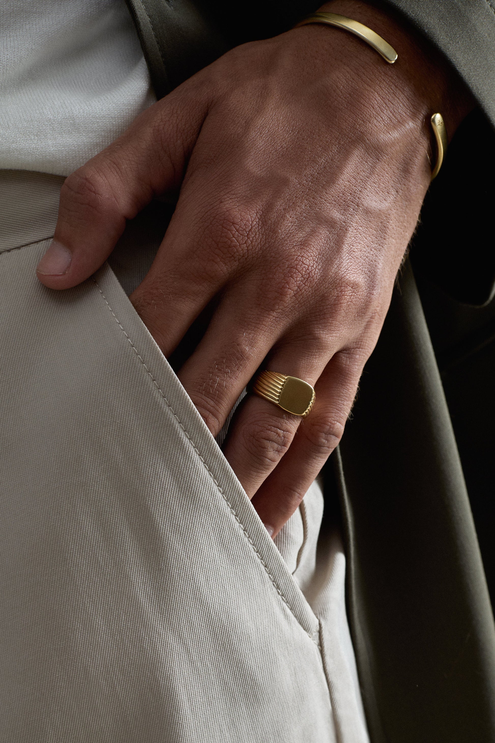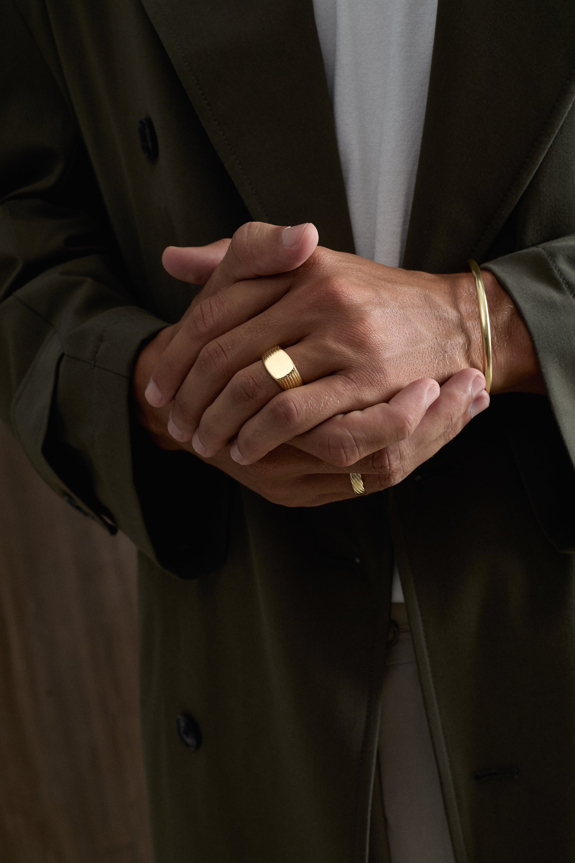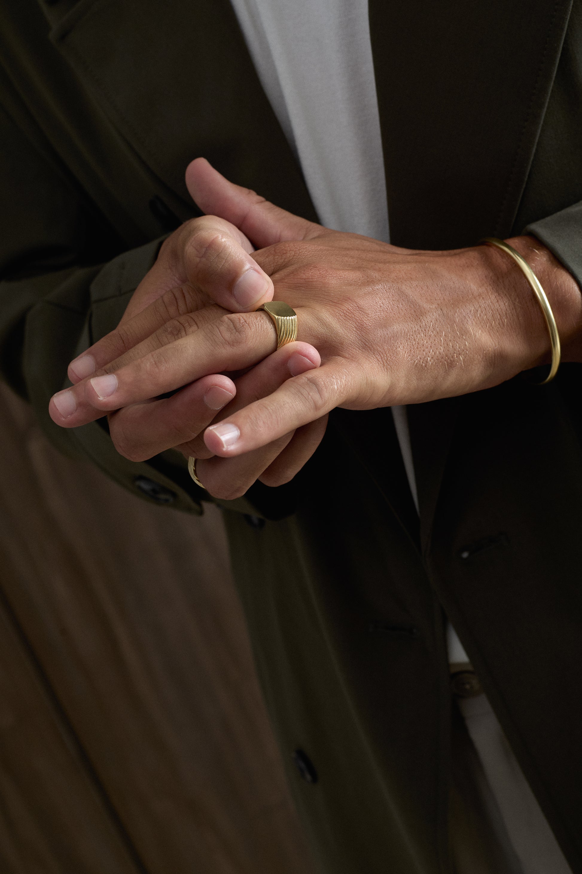 An heir to the family signet—sculpted ridges along the band, a calm polished face you can leave clean or engrave. Inspired by the kind worn by screen legends and old-world gentlemen—recut with modern movement. Wear it on the pinky for a classic nod.