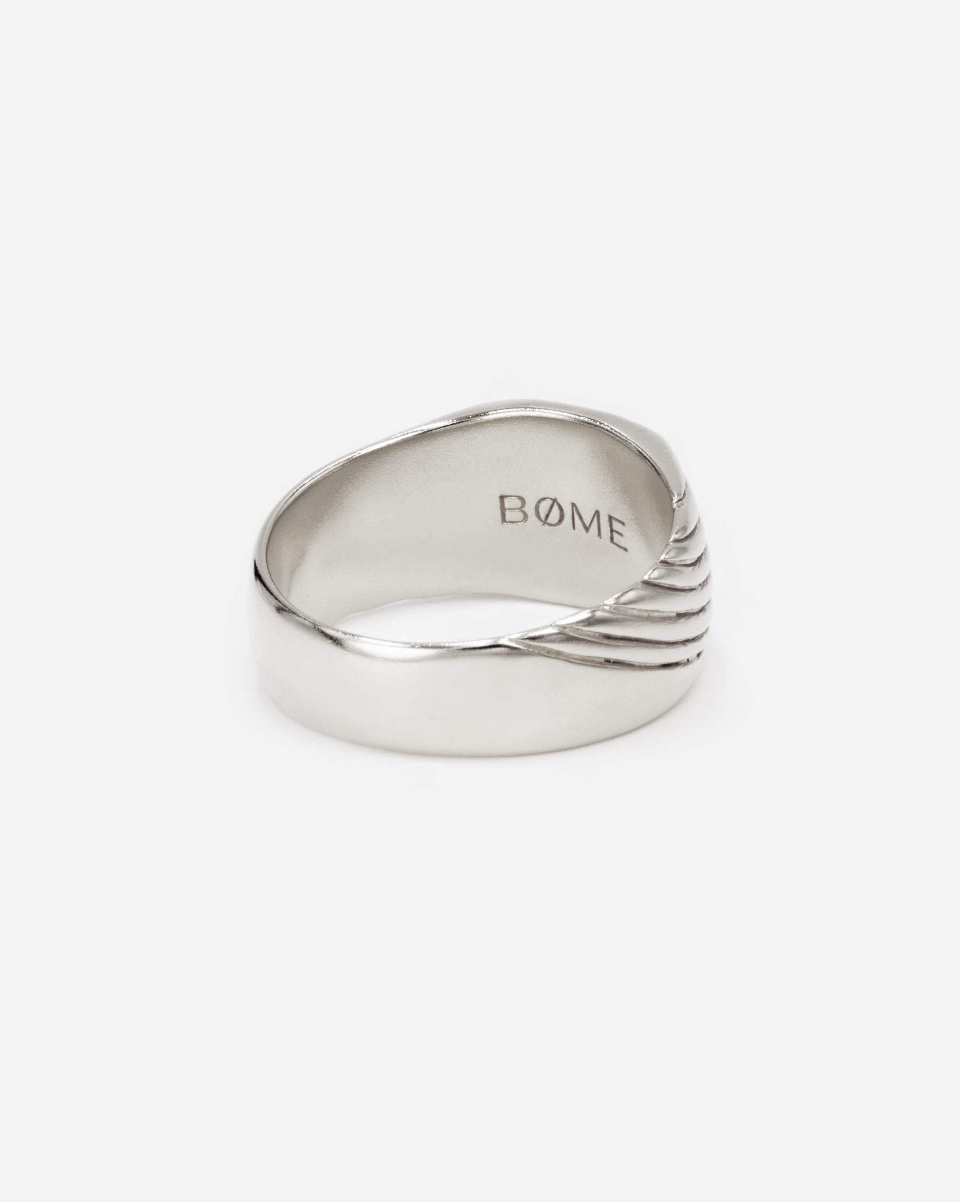 An heir to the family signet—sculpted ridges along the band, a calm polished face you can leave clean or engrave. Inspired by the kind worn by screen legends and old-world gentlemen—recut with modern movement. Wear it on the pinky for a classic nod.