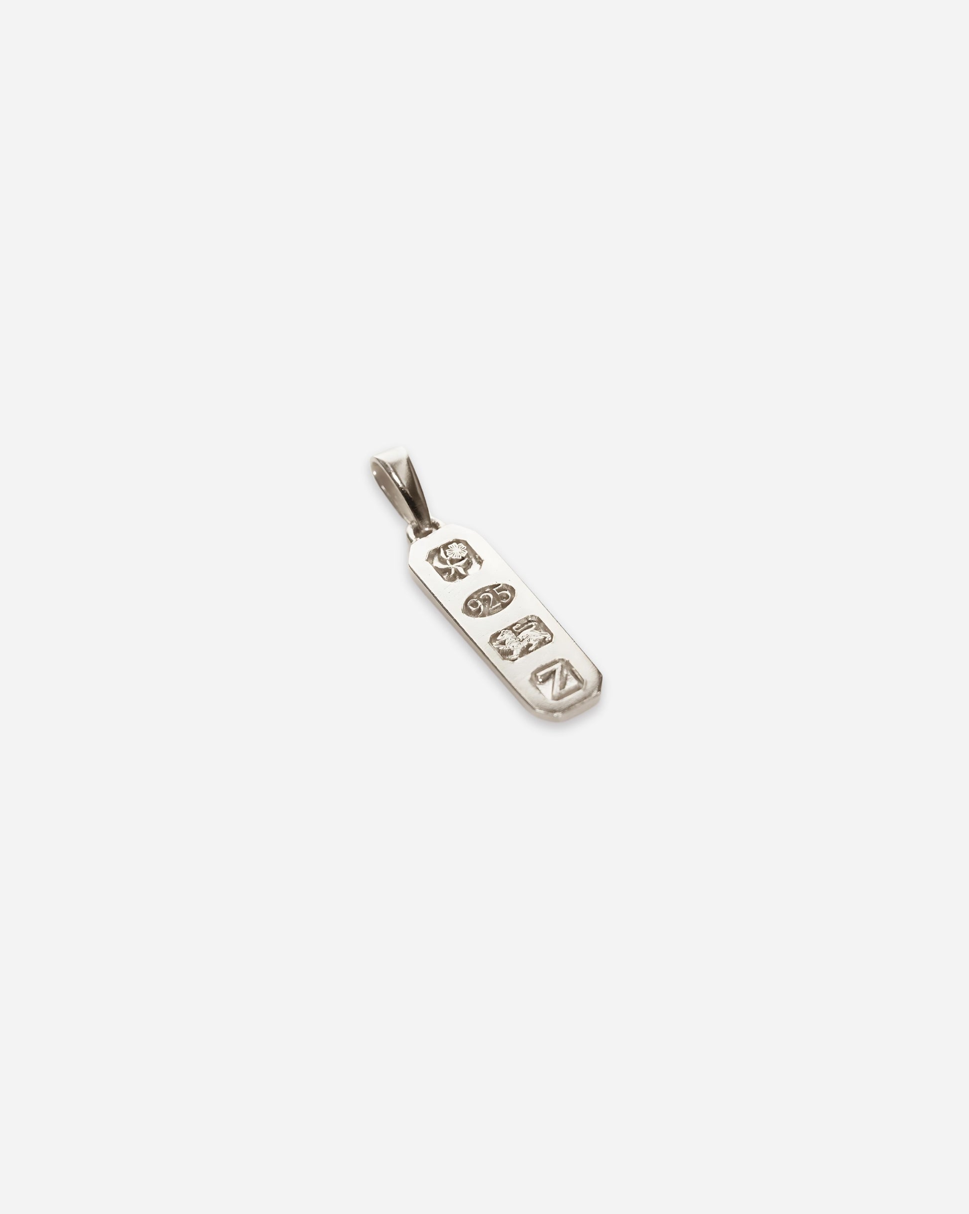 A traveler’s ingot, distilled. This pendant bears the BØME hallmarks. There is a symbolic language of hallmarking—maker’s flower, 925 for purity, lion for sterling silver—with a final stamp that’s yours: a hallmark year (shown as a letter) or a meaningful initial. Solid, minimal, built to carry your story.