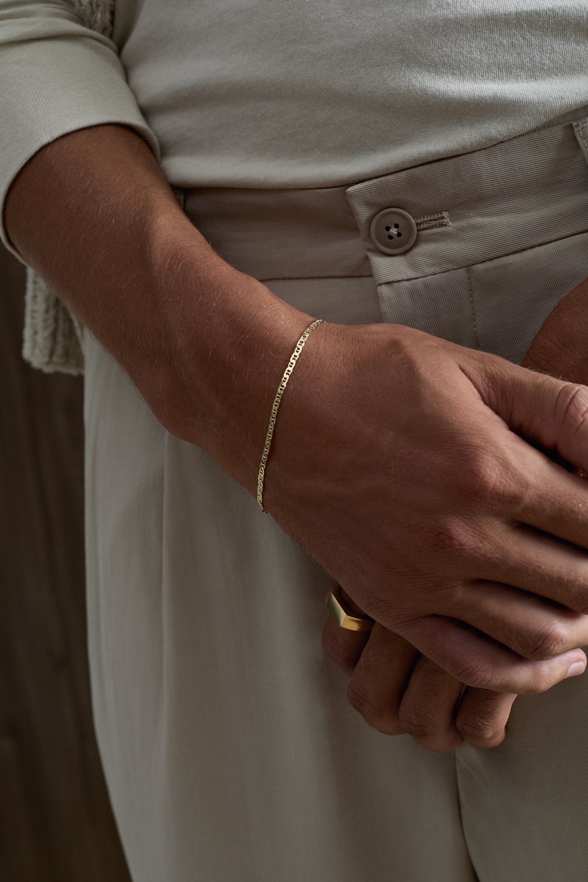Taking inspiration from nautical heritage, the Mariner’s interlocking links sit flat and clean on the wrist. Substantial in feel—grounded, comfortable. Solo or stacked, it stays steady.