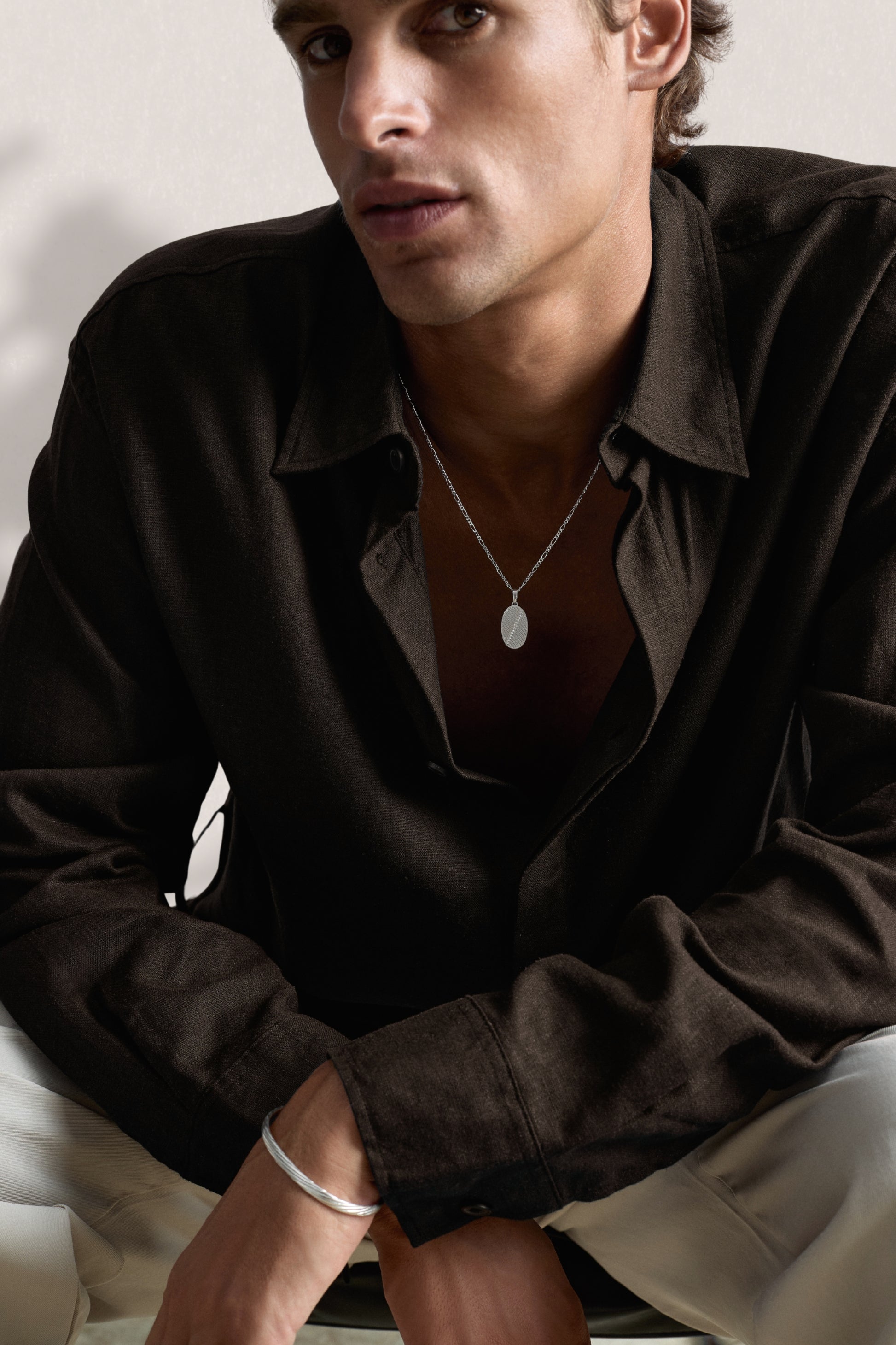 A timeless oval, cut from the landscape—sculpted ridges, soft light play, a surface that feels alive in the hand. The profile stays minimal and masculine, giving quiet definition to whatever you wear.