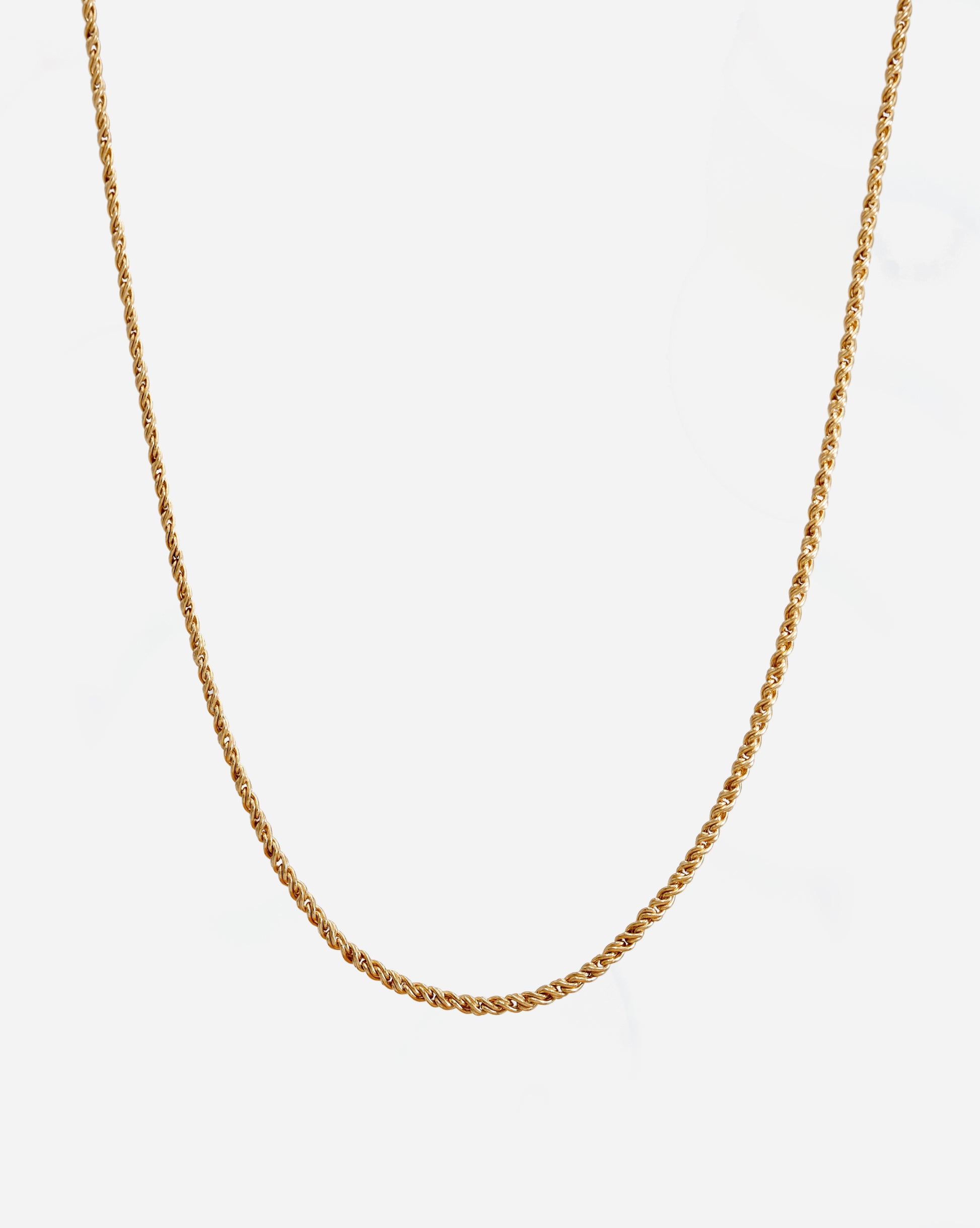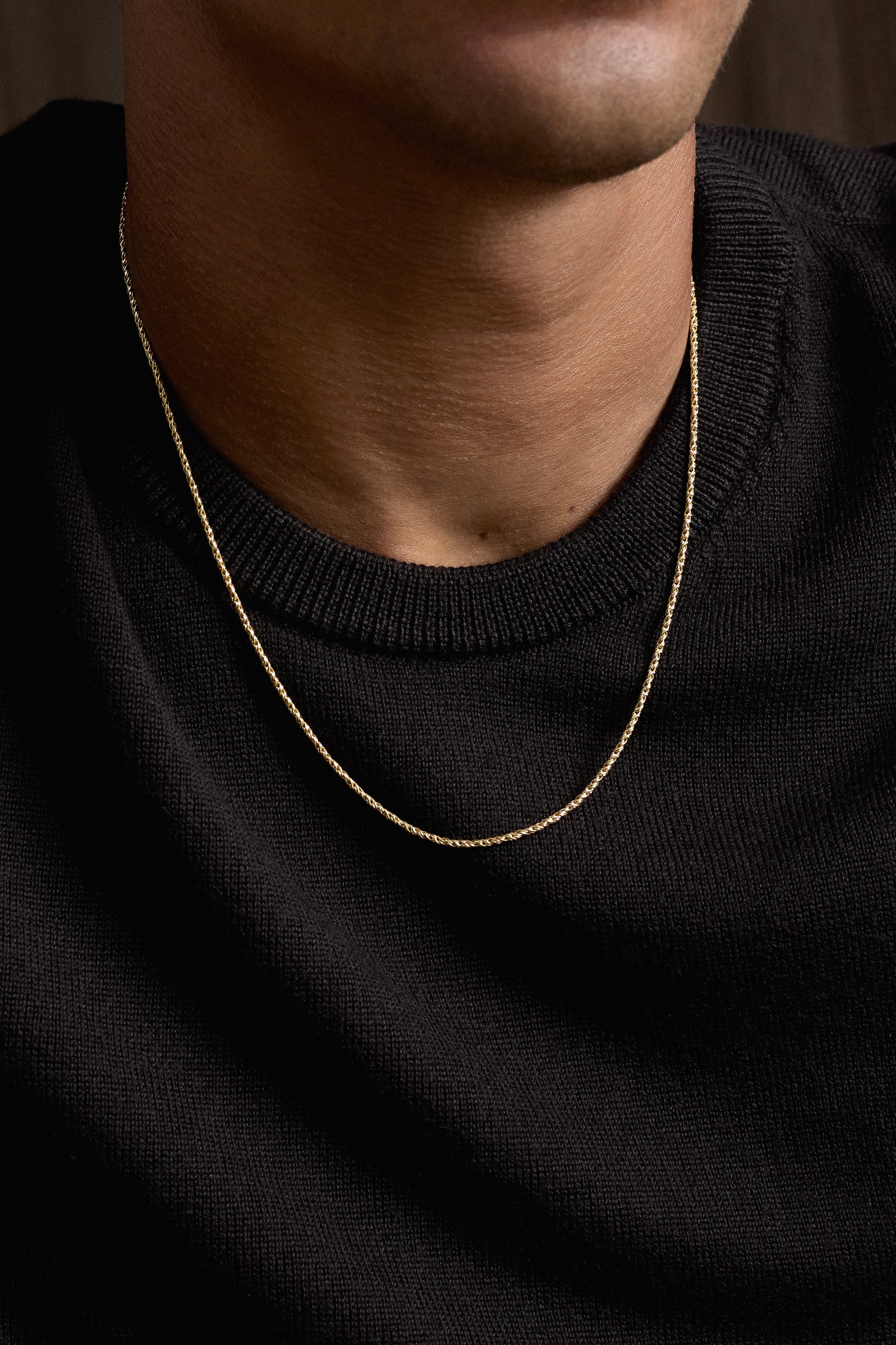 A refined rope chain: slim twist, subtle texture, easy drape. Reads minimal on its own and adds rhythm to a stack without the noise. Slow steps on stone, jacket thrown over a chair—the kind of cool that doesn’t rush.
