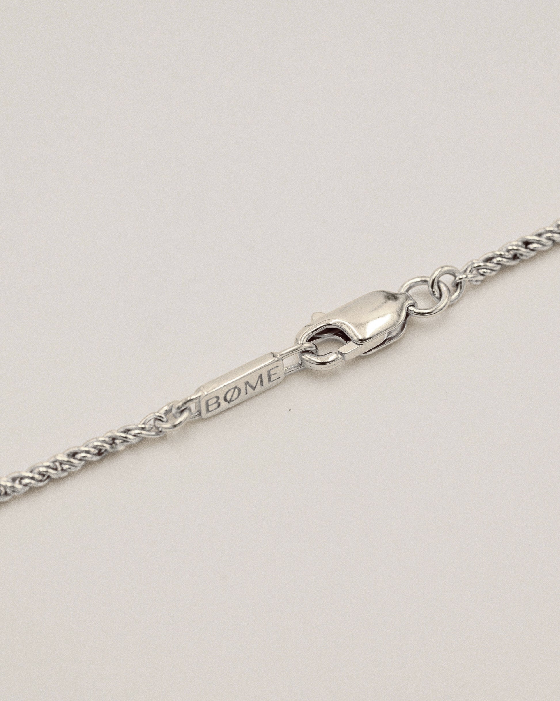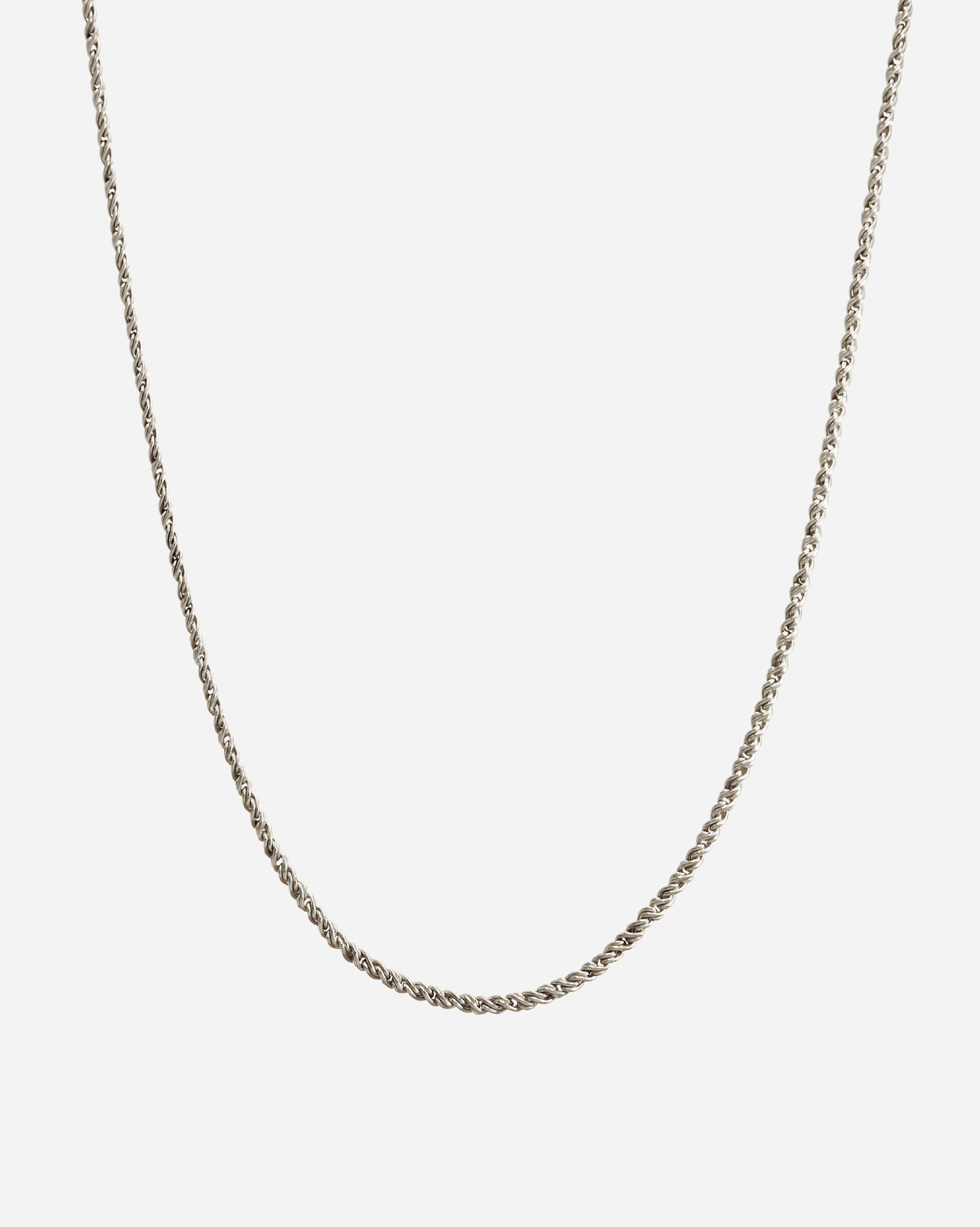A refined rope chain: slim twist, subtle texture, easy drape. Reads minimal on its own and adds rhythm to a stack without the noise. Slow steps on stone, jacket thrown over a chair—the kind of cool that doesn’t rush.